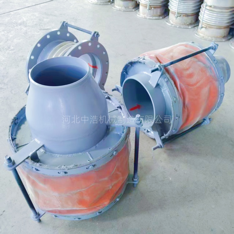 异径接管非金属补偿器,中浩机械拥有完善设计团队可根据实际工况定制不同产品,其结构组成多层复合蒙皮,同时满足密封、耐温和柔性补偿等多种功能蒙皮组成。特殊高温工况还可以增加硅酸铝棉隔热层和陶瓷纤维等。端管采用焊接金属接管或锥管大小头等过渡管,接管段按管道厚壁、材质等加工。可直接对焊、套接,可内置导流板增加限位拉杆,防止戒指直接冲击蒙皮,避免损坏,提升使用寿命。